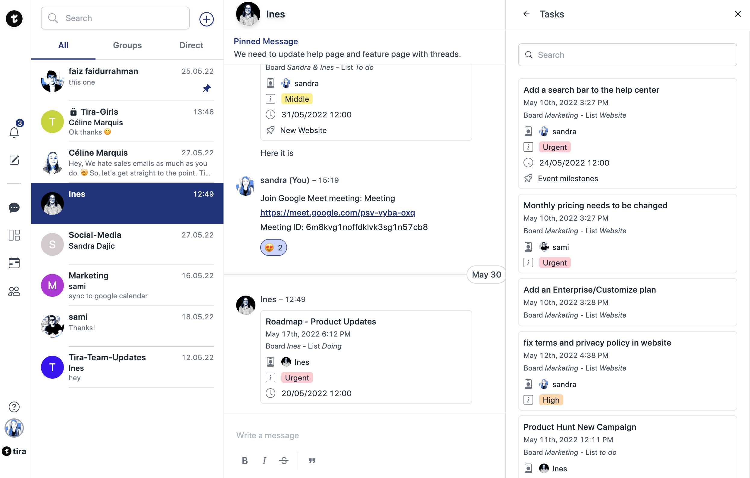 With Tira, teams are able to drag tasks directly from boards into the chat.
